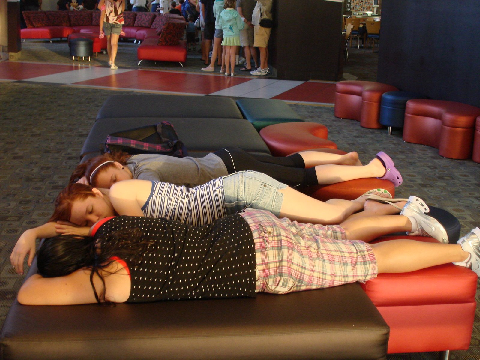| Em outra viagem, minhas pobres sobrinhas, vítimas do horário desumano do Mickey, dormem enquanto esperam nossa mesa ser liberada. |