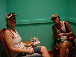 Sei que parece sala de espera de alguma costureira, mas é, sim, uma salinha no pavilhão do México do Epcot Center. Adesivos colados, lá fomos nós. Meio lerdinhas, só por volta do terceiro ou quarto pavilhão foi que nos demos conta de que o tal passaporte era uma atividade PARA CRIANÇAS. Ou seja, em cada país, na fila para carimbar os supracitados, havia umas dez criancinhas e… três patetas. A gente ria de se dobrar. A coitada da Renata, com febre, sentava e dizia que não aguentava mais. Eu e Bárbara, em nossa energia adolescente, puxávamos a coitada, e lá ia ela, arrastada.