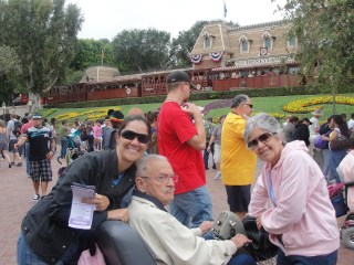 Estávamos na Disneyland. Não sei se já deu para notar, mas somos Disneymaníacos, então, como estávamos na Califórnia, era vital irmos à Disneyland. Nosso hotel tinha transporte para o parque. Como papai não gosta de acordar cedo (no que puxei a ele, claro), eu, mamãe e ele ficamos para ir mais tarde. Pegamos o ônibus e, ao chegar, ele precisou caminhar uma boa distância até o local em que alugamos a cadeira motorizada. Foi até preciso parar no caminho para ele sentar um pouco.