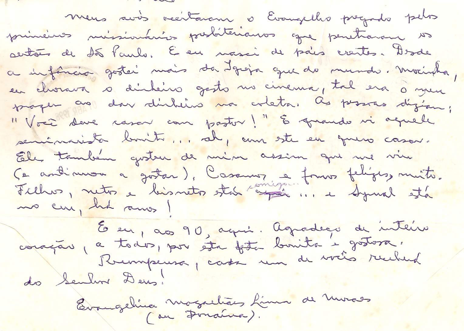 Será melhor que ela mesma conte o que aconteceu. Encontrei ontem, entre as páginas de um dos livros dela, que herdei, o que ela escreveu para dizer em sua festa de 90 anos, que aconteceu no dia 12.4.98, em São Paulo: